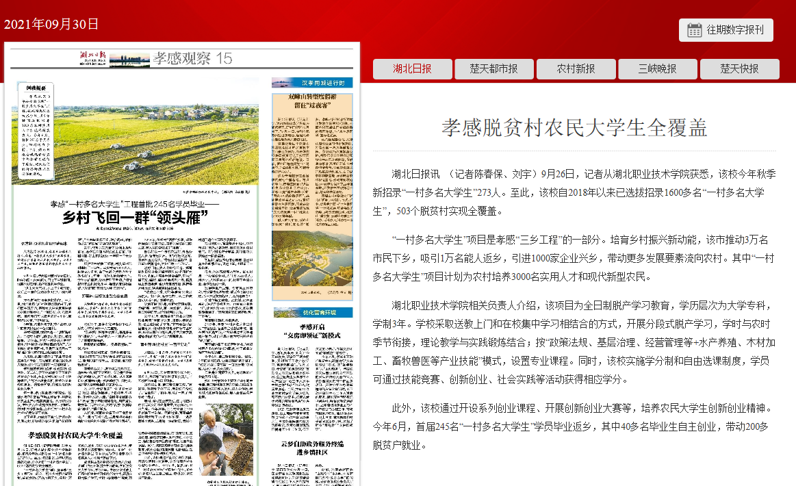 湖北日报讯 (记者陈春保、刘宇)9月26日,记者从九州线上平台获悉,该校今年秋季新招录“一村多名大学生”273人。至此,该校自2018年以来已选拔招录1600多名“一村多名大学生”,503个脱贫村实现全覆盖。