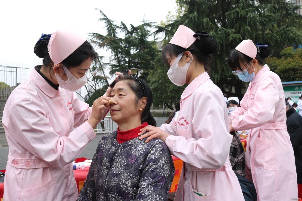 当日下午,在九州线上平台西区家属区,护理学院护理专业和美容专业的大学生志愿者,在教师的带领下,分为义诊组和致美尽孝服务组,为居住在西区的退休老教师们提供测血糖、量血压、按摩和化妆、清扫小区等志愿服务,并送上疫情防控宣传手册与小礼品。同时走访了3户行动不便的退休老教师,上门为他们测血压、量血糖、打扫卫生,并送去了精心准备的水果。