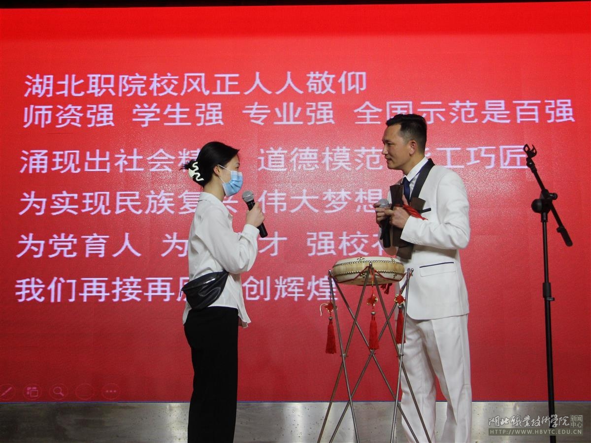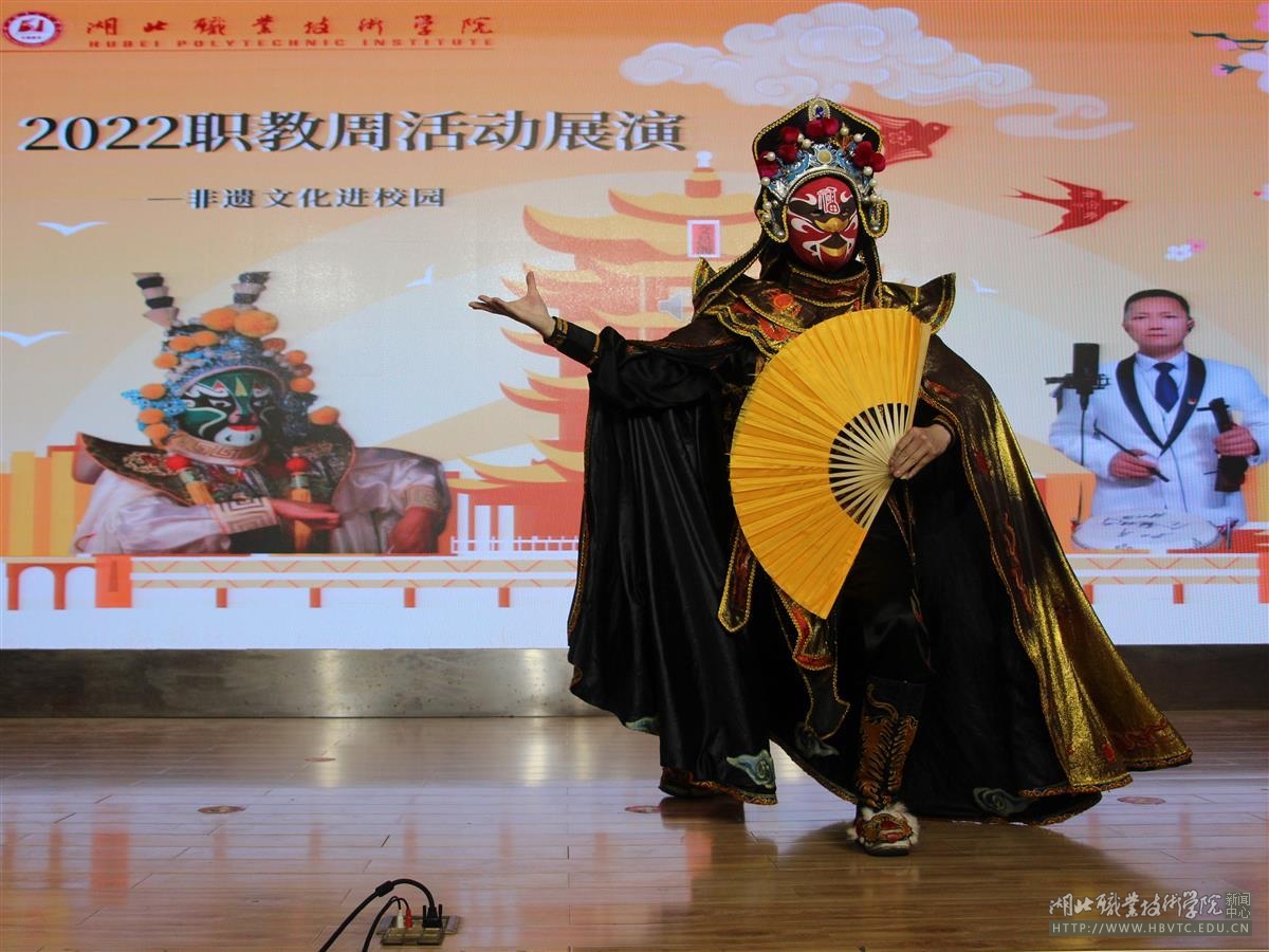 当日,学校特邀云梦县楚剧团青年演员、“湖北鼓王”张明智关门弟子陈加平参加非遗文化艺术展演活动。陈加平为师生们登台表演了川剧变脸、演唱了原创湖北大鼓《湖职防疫信心强》。