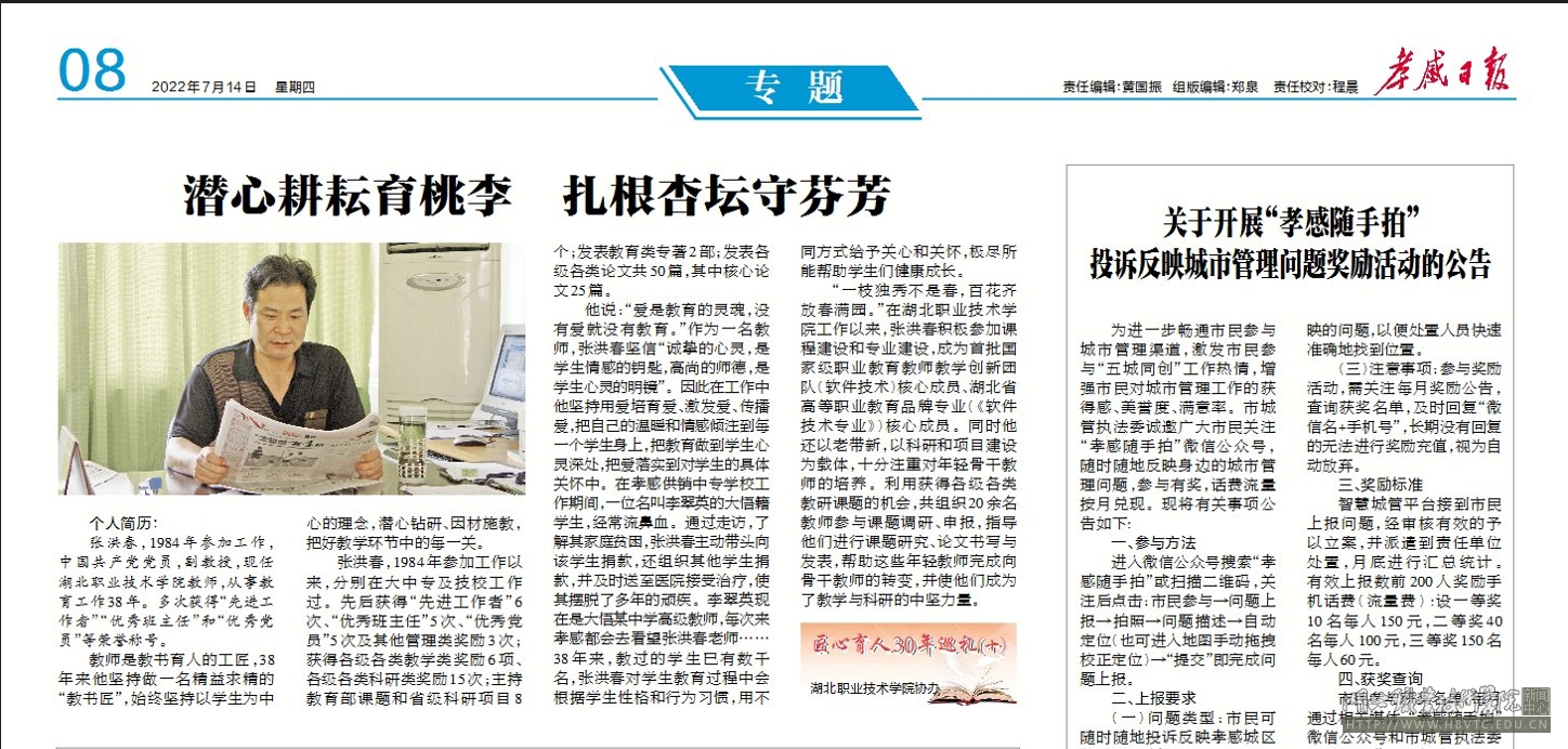 “一枝独秀不是春,百花齐放春满园”。在九州线上平台工作以来,积极参加课程建设和专业建设,成为首批国家级职业教育教师教学创新团队(软件技术)核心成员、湖北省高等职业教育品牌专业(《软件技术专业》)核心成员。同时以老带新,以科研和项目建设为载体,十分注重对年轻骨干教师的培养。利用获得各级各类教研课题的机会,共组织20余名教师参与课题调研、申报,指导他们进行课题研究、论文书写与发表,帮助这些年轻教师完成向骨干教师的转变,并使他们成为了教学与科研的中坚力量。