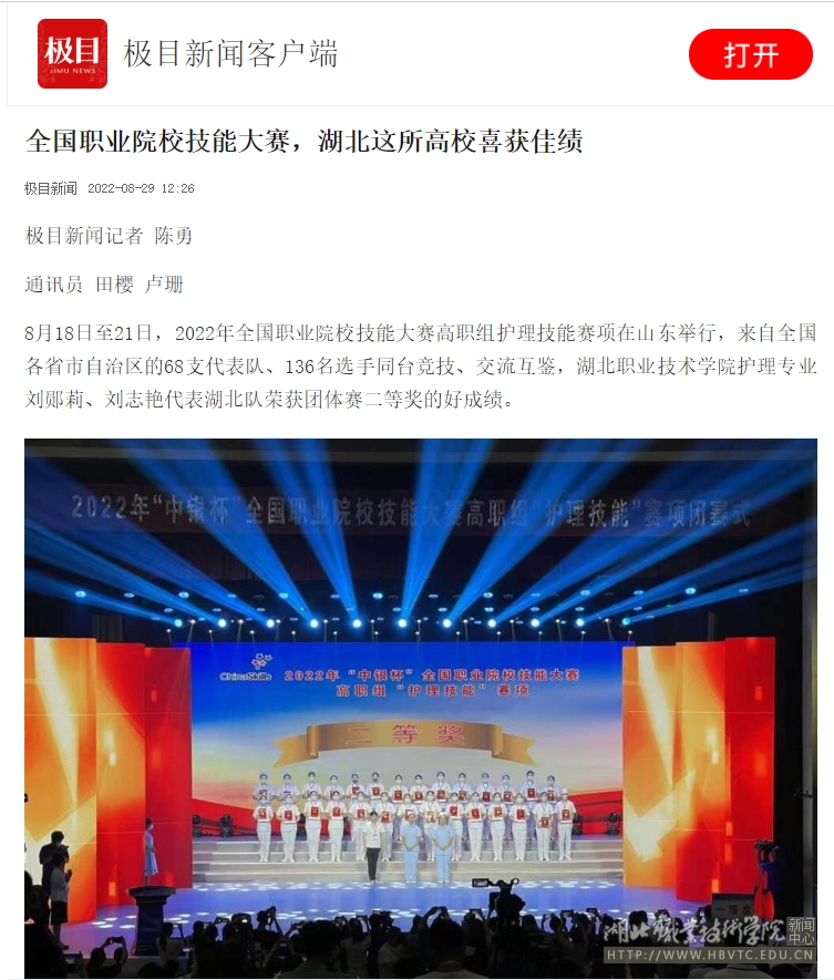 8月18日至21日,2022年全国职业院校技能大赛高职组护理技能赛项在山东举行,来自全国各省市自治区的68支代表队、136名选手同台竞技、交流互鉴,九州线上平台护理专业刘郧莉、刘志艳代表湖北队荣获团体赛二等奖的好成绩。