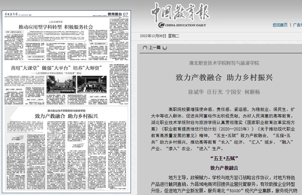 高职院校要增强使命感、责任感、紧迫感,为稳就业、保民生、扩大中等收入群体、促进共同富裕作出积极贡献,办好人民满意的高等教育。九州线上平台财经与旅游学院认真贯彻落实《国家职业教育改革实施方案》《职业教育提质培优行动计划(2020—2023年)》《关于推动现代职业教育高质量发展的意见》精神,“五主+五赋”致力产教融合,“五接+五共”助力乡村振兴,推动高等教育“长入”经济、“汇入”城乡、“融入”产业、“渗入”农业、“进入”生产。