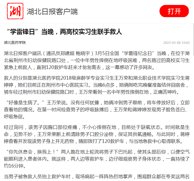 湖北日报客户端讯(通讯员郑建超 鲍晓宇)3月5日全国“学雷锋纪念日”当晚,在位于湖北省荆州市妇幼保健院路口处,一位中年男性摔倒在地呼吸困难,两名路过的高校实习生紧急上前救人,直到120救护车赶来才匆匆离去,这一幕感动了许多网友。