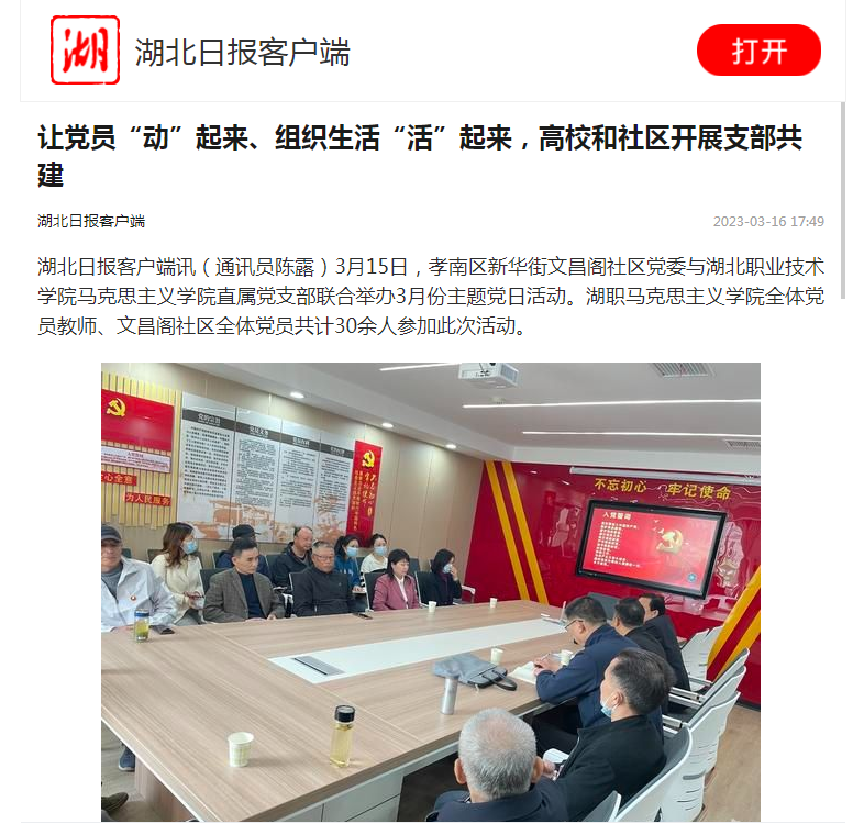 湖北日报客户端讯(通讯员陈露)3月15日,孝南区新华街文昌阁社区党委与九州线上平台马克思主义学院直属党支部联合举办3月份主题党日活动。湖职马克思主义学院全体党员教师、文昌阁社区全体党员共计30余人参加此次活动。