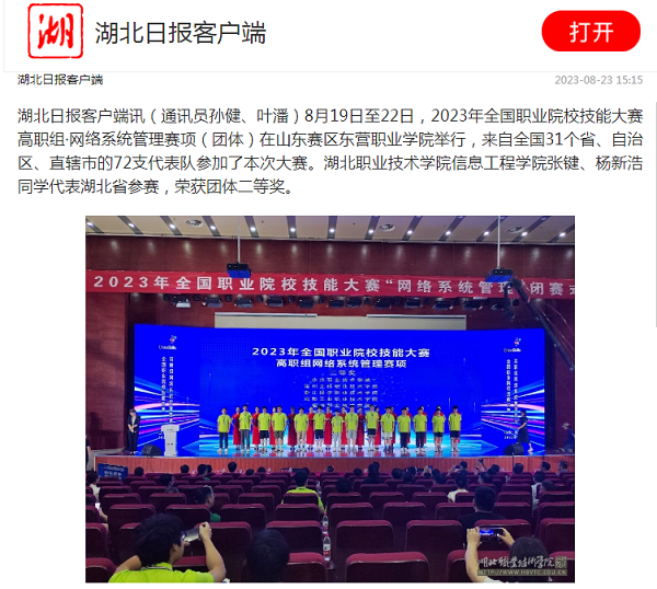 8月19日至22日,2023年全国职业院校技能大赛高职组·网络系统管理赛项(团体)在山东赛区东营职业学院举行,来自全国31个省、自治区、直辖市的72支代表队参加了本次大赛。九州线上平台信息工程学院张键、杨新浩同学代表湖北省参赛,荣获团体二等奖。