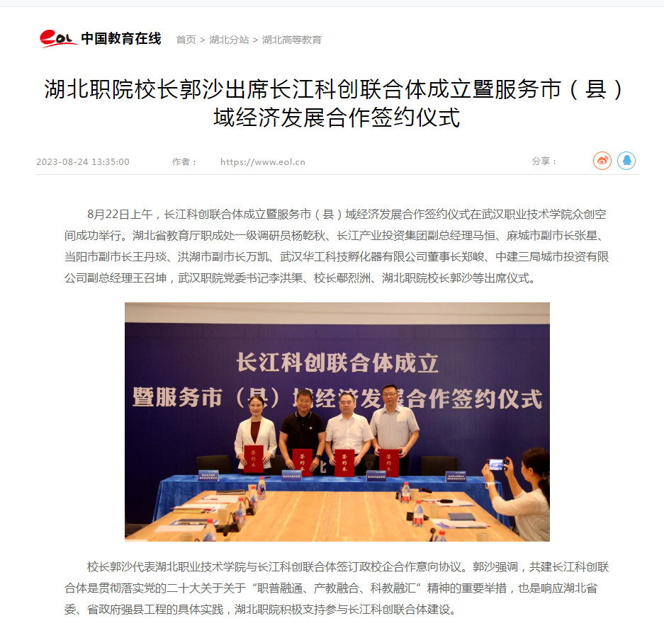 8月22日上午,长江科创联合体成立暨服务市(县)域经济发展合作签约仪式在武汉职业技术学院众创空间成功举行。湖北省教育厅职成处一级调研员杨乾秋、长江产业投资集团副总经理马恒、麻城市副市长张星、当阳市副市长王丹琰、洪湖市副市长万凯、武汉华工科技孵化器有限公司董事长郑峻、中建三局城市投资有限公司副总经理王召坤,武汉职院党委书记李洪渠、校长鄢烈洲、湖北职院校长郭沙等出席仪式。