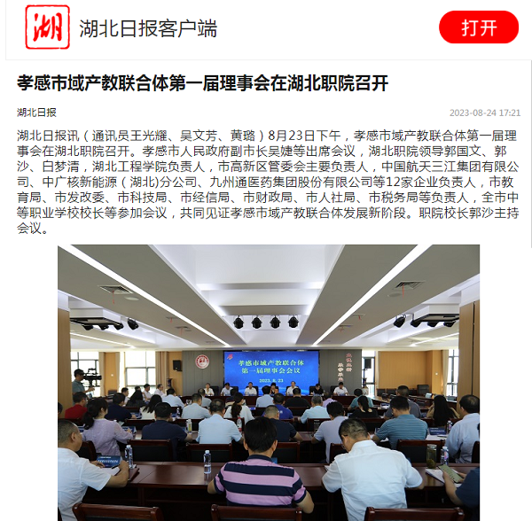 8月23日下午,孝感市域产教联合体第一届理事会在我校南校区图新大楼6楼召开。孝感市人民政府副市长吴婕等出席会议,湖北职院领导郭国文、郭沙、白梦清,湖北工程学院负责人,市高新区管委会主要负责人,中国航天三江集团有限公司、中广核新能源(湖北)分公司、九州通医药集团股份有限公司等12家企业负责人,市教育局、市发改委、市科技局、市经信局、市财政局、市人社局、市税务局等负责人,全市中等职业学校校长等参加会议,共同见证孝感市域产教联合体发展新阶段。职院校长郭沙主持会议。