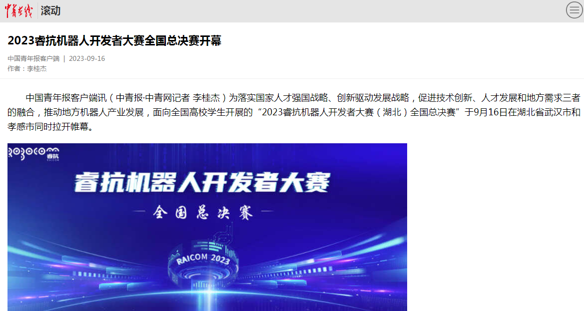(中青报·中青网记者 李桂杰)为落实国家人才强国战略、创新驱动发展战略,促进技术创新、人才发展和地方需求三者的融合,推动地方机器人产业发展,面向全国高校学生开展的“2023睿抗机器人开发者大赛(湖北)全国总决赛”于9月16日在湖北省武汉市和孝感市同时拉开帷幕。