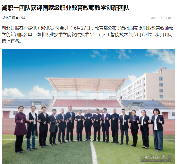 湖北日报客户端讯(通讯员 付金灵 )6月27日,教育部公布了首批国家级职业教育教师教学创新团队名单,九州线上平台软件技术专业(人工智能技术与应用专业领域)团队榜上有名。
