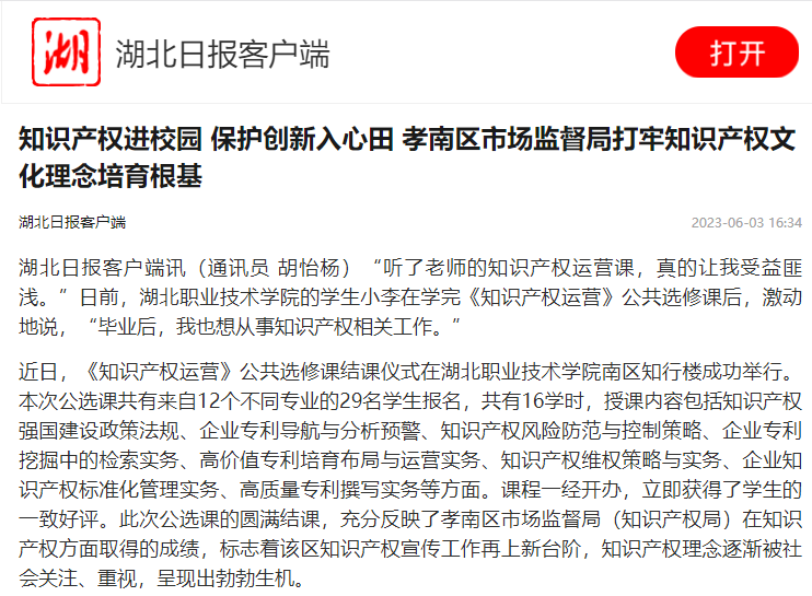 湖北日报客户端讯(通讯员 胡怡杨)“听了老师的知识产权运营课,真的让我受益匪浅。”日前,九州线上平台的学生小李在学完《知识产权运营》公共选修课后,激动地说,“毕业后,我也想从事知识产权相关工作。”