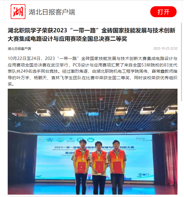 10月22日至24日,2023“一带一路”金砖国家技能发展与技术创新大赛集成电路设计与应用赛项全国总决赛在武汉举行,PCB设计与应用赛项汇聚了来自全国53所院校的83支代表队共249名选手同台竞技。经过激烈角逐,由湖北职院机电工程学院周伟、薛常鑫教师指导的叶万宇、杨颢天、袁林飞学生团队在比赛中荣获全国二等奖,同时该校荣获优秀组织奖。