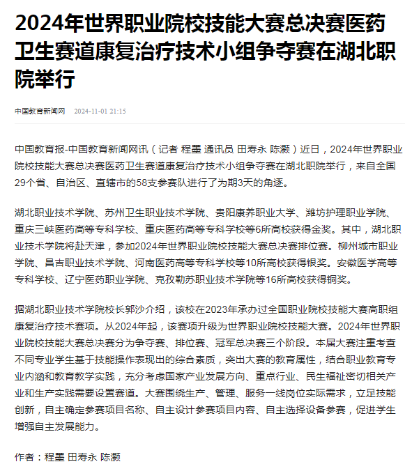 中国教育报-中国教育新闻网讯(记者 程墨 通讯员 田寿永 陈灏)近日,2024年世界职业院校技能大赛总决赛医药卫生赛道康复治疗技术小组争夺赛在湖北职院举行,来自全国29个省、自治区、直辖市的58支参赛队进行了为期3天的角逐。