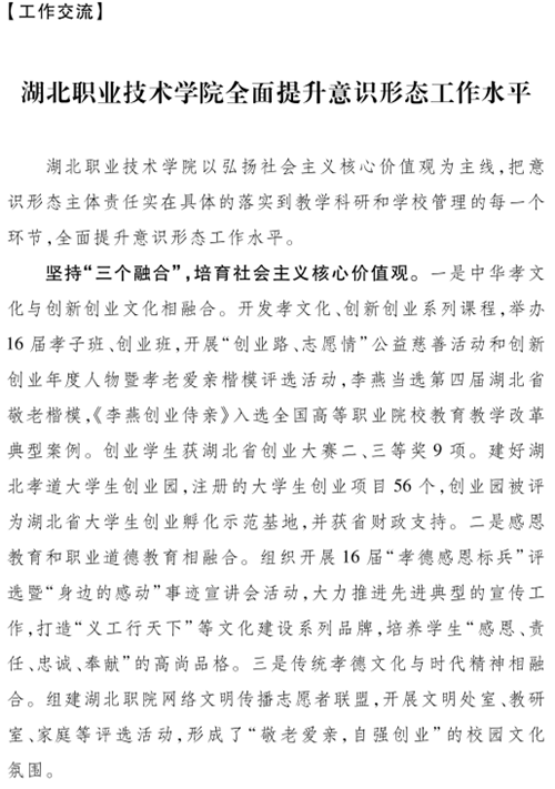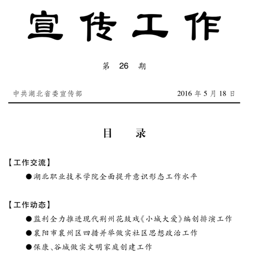 近日,中共湖北省委宣传部印发了内部刊物《宣传工作》第26期,在“工作交流”栏目全文刊发了我校扎实做好意识形态工作的经验和做法。