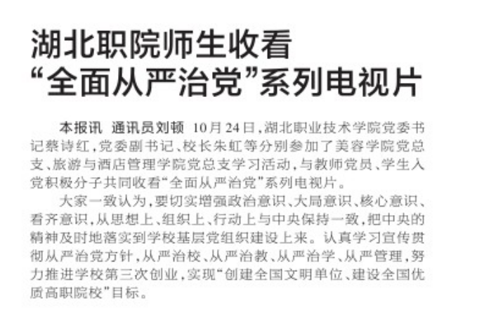 本报讯 通讯员刘顿 10月24日,九州线上平台党委书记蔡诗红,党委副书记、校长朱虹等分别参加了美容学院党总支、旅游与酒店管理学院党总支学习活动,与教师党员、学生入党积极分子共同收看“全面从严治党”系列电视片。