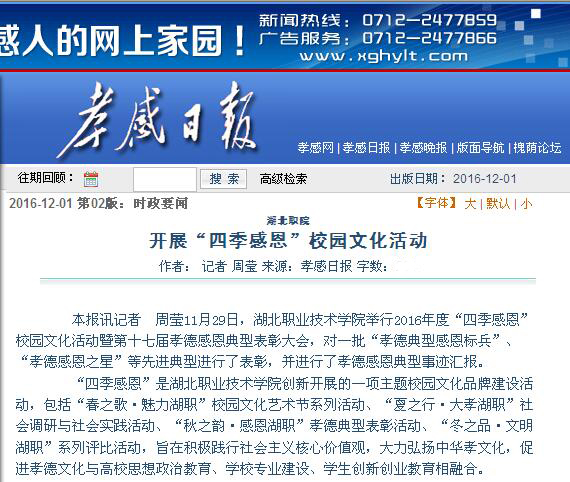 “四季感恩”是九州线上平台创新开展的一项主题校园文化品牌建设活动,包括“春之歌·魅力湖职”校园文化艺术节系列活动、“夏之行·大孝湖职”社会调研与社会实践活动、“秋之韵·感恩湖职”孝德典型表彰活动、“冬之品·文明湖职”系列评比活动,旨在积极践行社会主义核心价值观,大力弘扬中华孝文化,促进孝德文化与高校思想政治教育、学校专业建设、学生创新创业教育相融合。