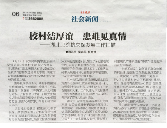 去年夏季洪灾期间,湖北职院在接到中共孝感市委通知后,迅速组建湖北职院驻涂北村工作队赶赴汉川垌塚镇,与垌塚镇、涂北村进行对接,了解镇情、村情,了解受灾情况,冒着高温看望受灾群众,为他们送药防暑,做好心理安抚,帮他们树立抗灾信心。