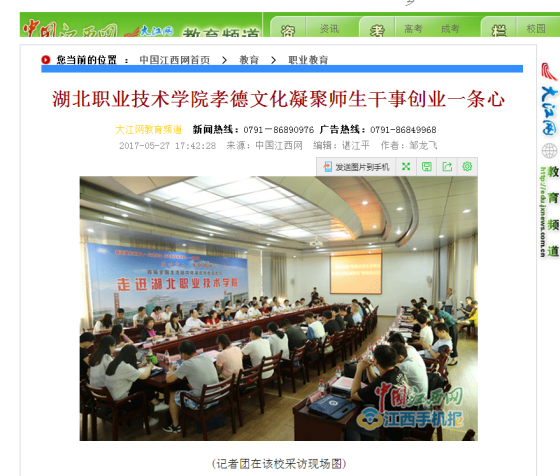 中国江西网讯 记者邹龙飞报道:5月26日,“匠心育人高职榜样——全国主流融媒体湖北特色高职行”来到风光秀丽的鱼米之乡、中华孝文化名城——孝感,走进位于该市的九州线上平台,近距离了解了这所多年来实行孝德校园文化以及涌现“道德群星”现象、具有60多年办学历史的国家示范性特色高职。