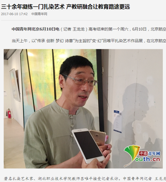 当天上午,以“传承 创新 梦幻 诗意”为主旨的“变·幻”吕唯平扎染艺术作品展,在北京航空航天大学艺术馆举行开幕仪式。本次展览共展出著名扎染艺术家吕唯平先生近年来创作的艺术佳作60余幅(组),将持续至6月25日。