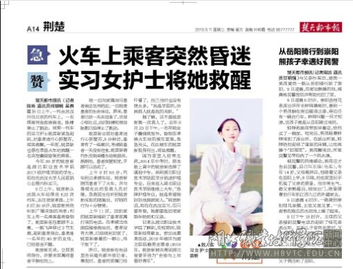 楚天都市报讯(记者:陈咏 通讯员:何顺畅 吴春花)9日上午,一列由武汉开往北京的列车上,一名乘客突发疾病昏迷,脉搏停止了跳动。同乘一列车的实习护士姚苗新紧急赶到,对患者进行心肺复苏,将其救醒。一年前,姚苗新也曾在孝昌火车站救醒一名突发癫痫昏倒的乘客。