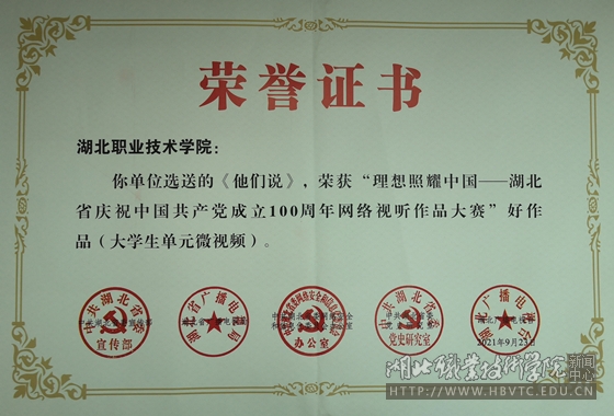 (本网记者:卢雅雪)为深入学习贯彻习近平新时代中国特色社会主义思想,隆重庆祝中国共产党成立100周年,由中共湖北省委宣传部、湖北省广播电视局、中共湖北省委网络安全和信息化委员会办公室、中共湖北省委党史研究室和湖北广播电视台联合举办的“理想照耀中国——湖北省庆祝中国共产党成立100周年网络视听大赛”圆满收官。日前,经反复遴选、多轮评审和公示,各系列获奖结果揭晓。我校自主创作的微视频《他们说》、网络宣传片《职教映初心》分别荣获好作品奖。