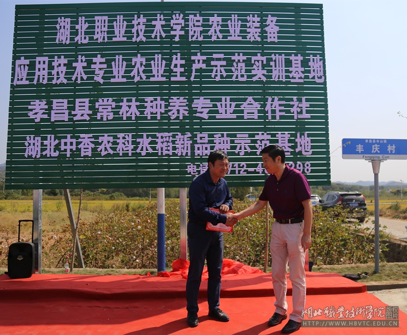 9月27日上午,揭牌仪式在孝昌县丰山镇丰庆村顺利举行。学校副校长李佳圣、机电工程学院负责人袁晓洲、教务处副处长王俊平,孝昌县丰山镇党政负责人、湖北中香农科水稻新品种育种公司经理刑冬、孝昌县常林种养专业合作社董事长沈常林、湖北顺业农业机械有限公司董事长肖继顺、孝南区农业技术推广中心主任易齐圣、孝昌县丰山镇丰庆村村两委班子成员等参加了相关活动。揭牌仪式由袁晓洲主持。