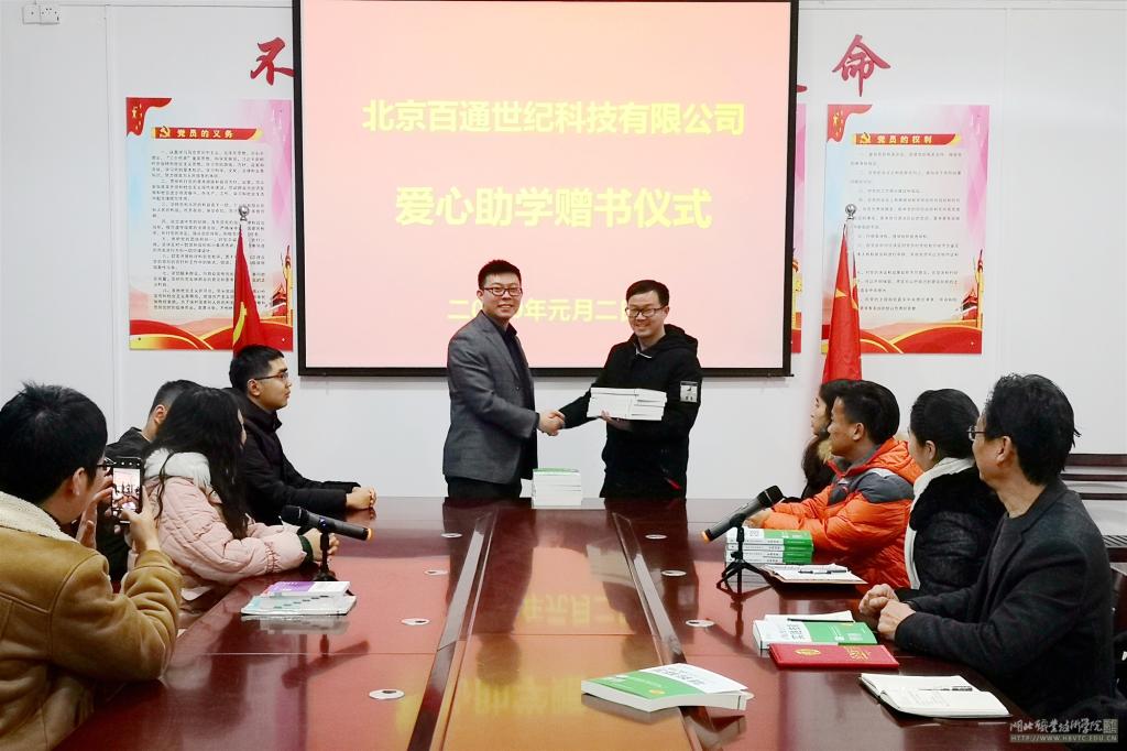 1月2日,北京百通世纪科技有限公司爱心助学赠书仪式在立新楼党员活动室举行,医学院院长许三林、副院长张舟、陈军芳、临床医学专业负责人岳新荣、临床医学专业2018级学生代表参加了座谈会。会议由副院长陈军芳主持。