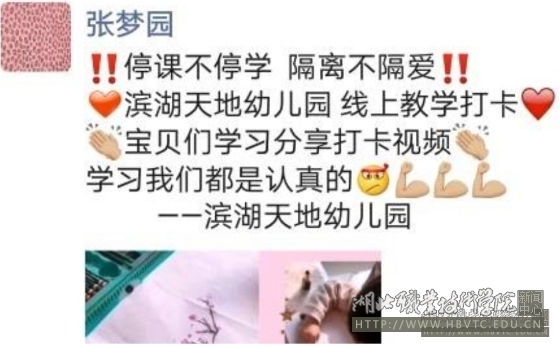 学前教育专业五年一贯制2019级大专学生张梦园,上学期在滨湖天地幼儿园实习,与小朋友结下深厚感情。寒假本来实习任务结束,但挂念班上有3名孩子的父母是医生、护士,没人照顾,就开通网上教学模式,讲幼儿故事,唱幼儿歌曲,跳幼儿舞蹈,陪伴孩子,解除医护人员的后顾之忧。
