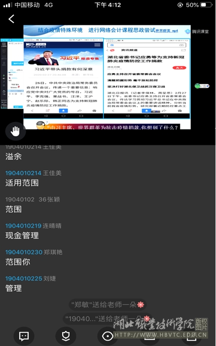 3月7日下午,财经学院组织教研室主任和会计教研室全体教师进入周雪艳老师的腾讯课堂,听取了周老师的线上教学课程《初级会计实务》,并在听课后进行了qq视频集体评课,教务处处长黄享苟、督导室周文老师全程参加了听课和评课活动。