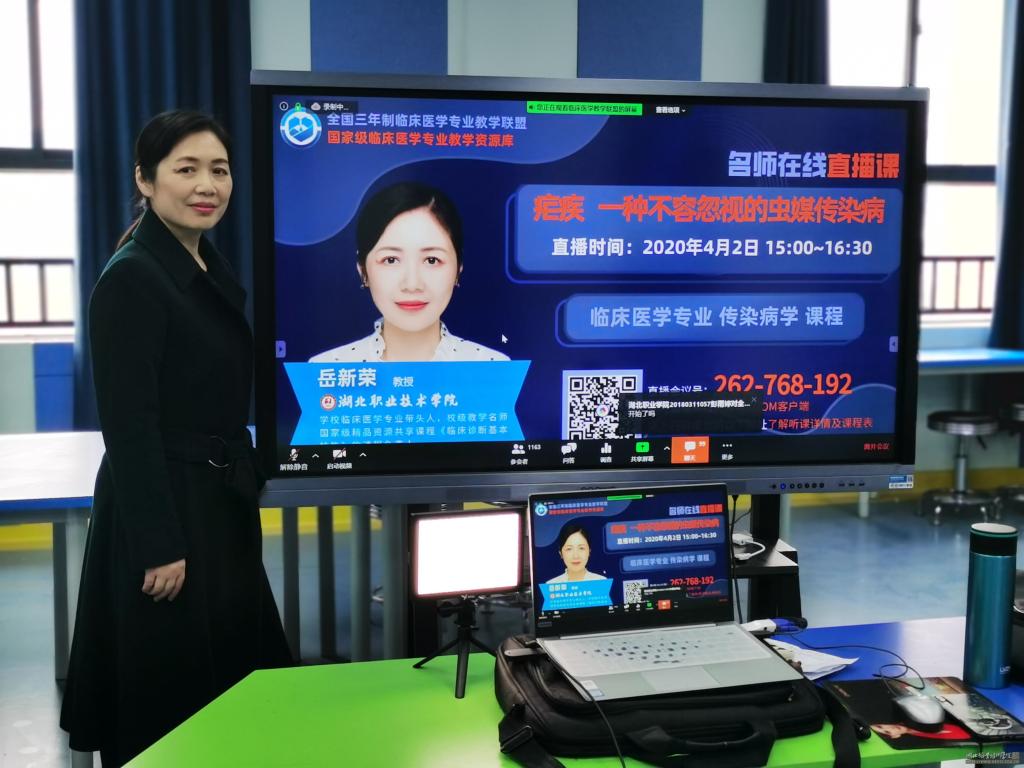 4月2日,学校临床医学专业专业带头人岳新荣教授参加了全国临床医学专业(三年制)教学联盟举办的“名师在线直播课”,来自九州线上平台、肇庆医学高等专科学校、沧州医学高等专科学校、漯河医学高等专科学校等全国多所高职高专院校共二千二百余名师生在线聆听了岳教授的精彩授课。学校校长朱虹、副校长李佳圣,教务处处长黄享苟等以各种形式观摩了岳新荣教授的授课。