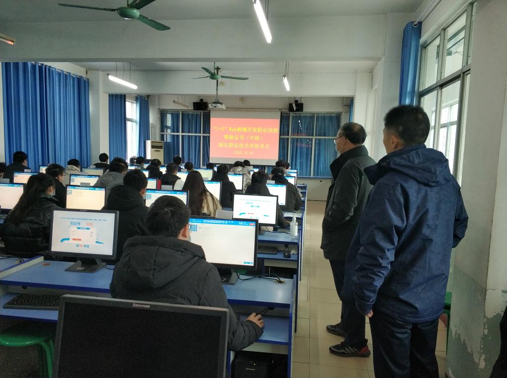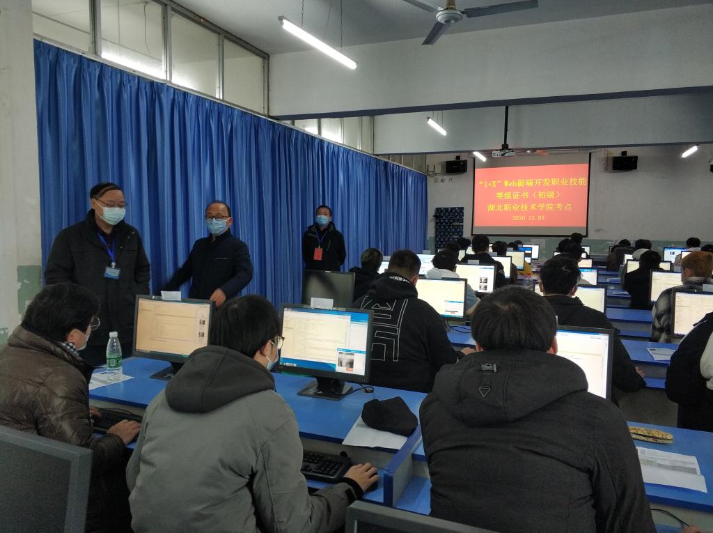 九州线上平台考点安排了初级和中级两个考场。信息技术学院组织了100人规模、为期一个月的考前培训,经过严格筛选,选取了37名同学报名参加初级考试,28名同学报名参加中级考试。整个考试组织严密、秩序井然。同学们反映培训针对性强、效果好,对“1+X”Web前端开发职业技能等级证书的取得充满信心。
