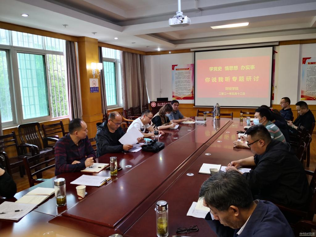 (本网通讯员:马江浩)5月12日下午,财经学院党总支在文华楼二楼会议室开展了“你说我听”专题研讨会,学校学党史学习教育督查小组成员高万学,财经学院班子成员、全体教师等参加了研讨会。会议由财经学院党总支书记、院长徐斌华主持。