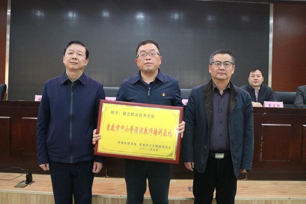 期间,蔡全民、王建军联合授予我校“孝感市中小学保健教师专项培训基地”牌匾。