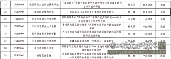 (本网通讯员:邹小云)日前,教育部职业院校外语类专业教学指导委员会公布了“2019年度职业院校外语教育教学研究课题”结题验收结果(外语教指委[2021]15号),我校陈璇副教授主持的《高职高专< 大学英语>课程思政实践研究》课题通过专家组鉴定,顺利完成课题结题。
