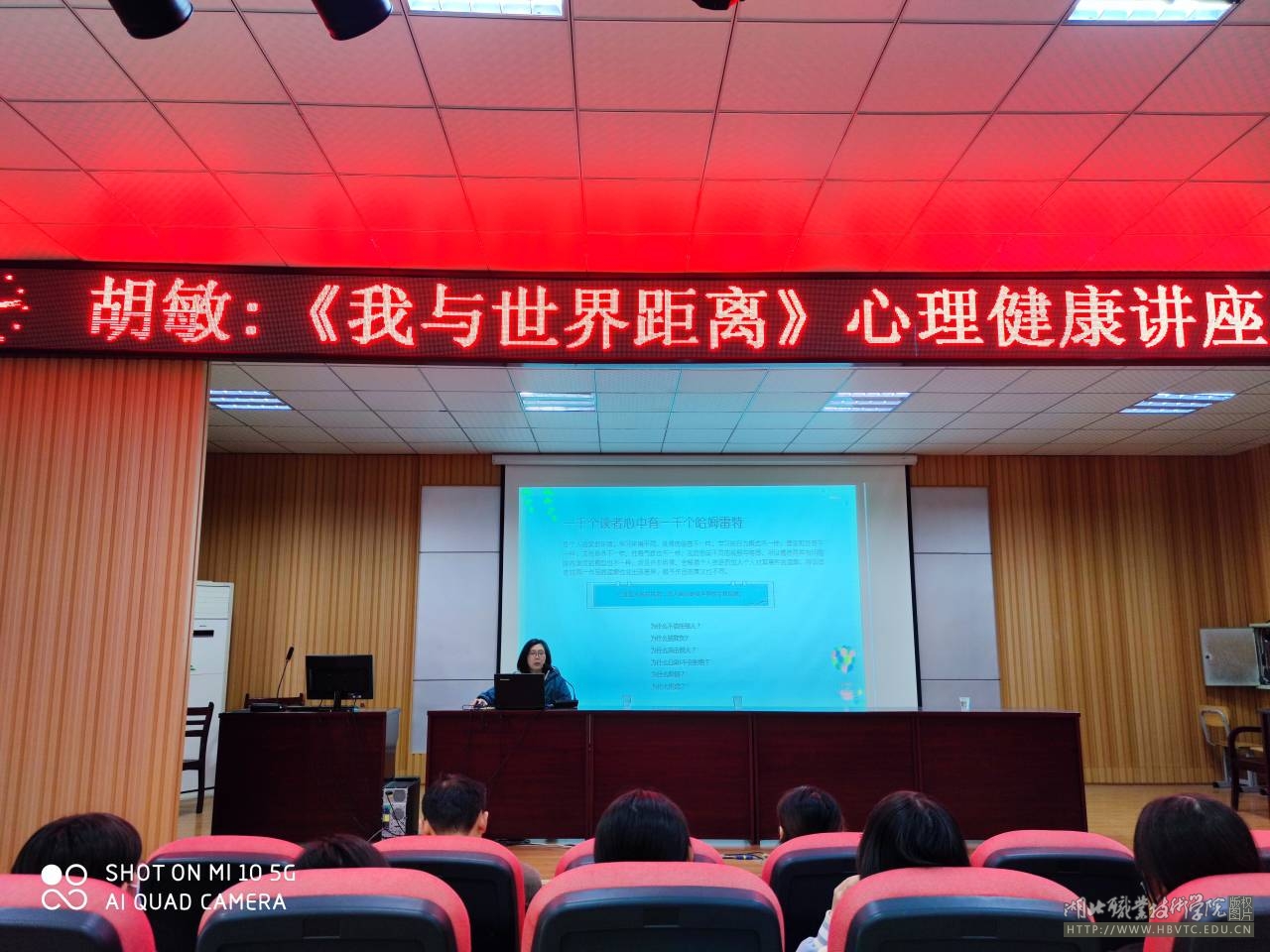 (本网通讯员:余翠琴)育人必先育心,身心健康才是真正的健康。为贯彻学校心理健康教育专题会议精神,11月17日,教育与艺术学院(孝感师范学校)邀请学校心理健康教育中心的胡敏老师为师范校区学生代表作了题为《我与世界的距离》的专题讲座。教育与艺术学院院长肖成林、副院长张玮和160余名师生代表聆听讲座。