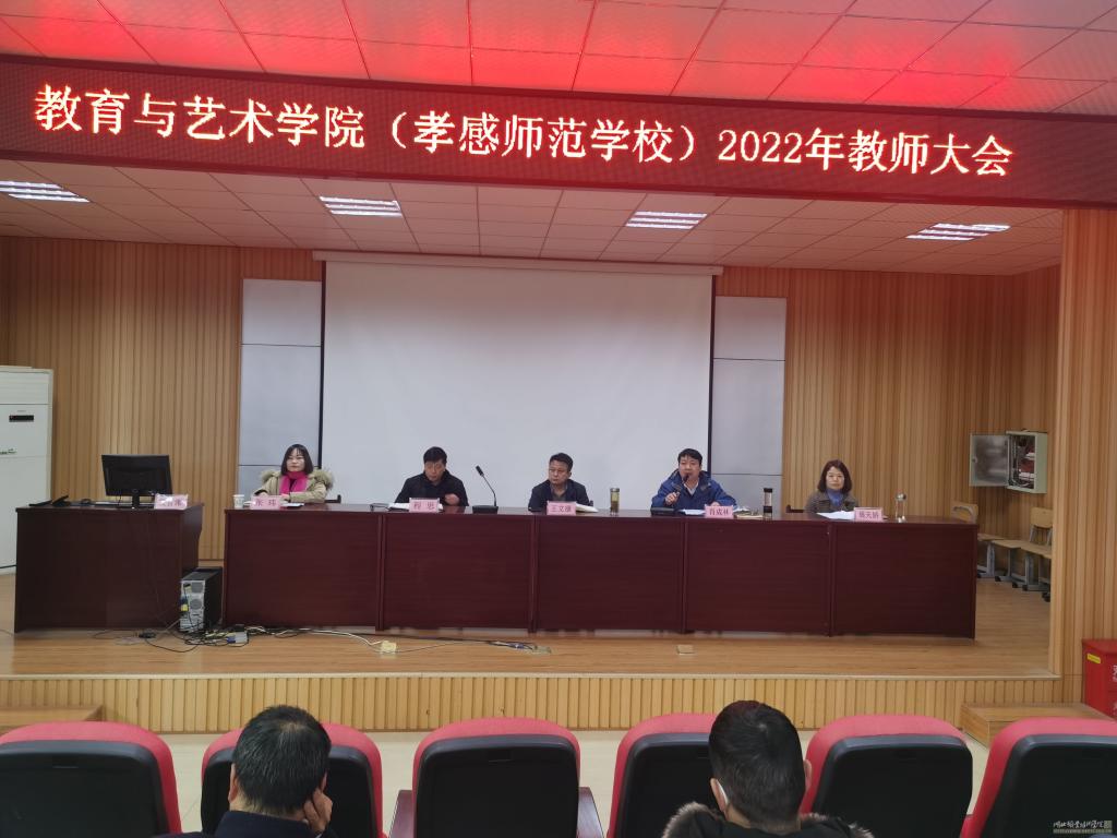 (本网通讯员:黄兰)2月21日下午,教育与艺术学院(孝感师范学校)2022年新学期教师大会在师范校区办公楼五楼报告厅召开。学校党委委员、纪委书记、监察专员王文康出席并讲话,教艺(师范)全体教职工100余人参加了会议。会议由教育与艺术学院院长肖成林主持。