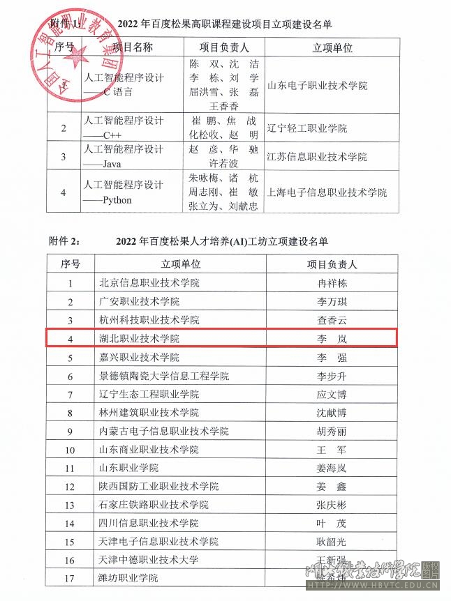 (本网记者:熊世明)近日,中国高职高专教育网公布了2022年百度松果学堂高校合作项目资助计划立项建设名单,我校成功入围2022年百度松果人才培养(AI)工坊立项建设项目。