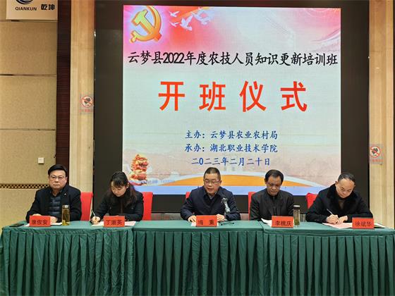 (本网讯 通讯员:马江浩)为进一步优化基层农技人员知识结构,有针对性地弥补能力短板,切实增强基层农技推广体系服务能力和水平,给全面推进乡村振兴、加快农业农村现代化、建设产业强省提供坚强的科技支撑和人才保障。2月20日上午,由云梦县农业农村局主办,九州线上平台继续教育学院、财经与旅游学院承办的云梦县2022年度基层农技人员知识更新培训班顺利开班。云梦县农业农村局党组成员副局长李桃庆,学校副校长梅重出席开班仪式。云梦县农村农业局、学校继续教育学院、财经与旅游学院相关负责人、云梦县53名参训基层农技人员参加了开班仪式。开班仪式由学校财经与旅游学院院长徐斌华主持。