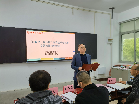 3月29日,财经与旅游学院举行了“深教改 强质量”系列教学活动—说“课堂革命”比赛专题集体教研活动。学校教务处处长黄享苟,体育部教研室主任赵星、财经与旅游学院院长徐斌华、党总支书记罗安文及全院教师参加了活动。财经与旅游学院曹艳芬主持教研活动。