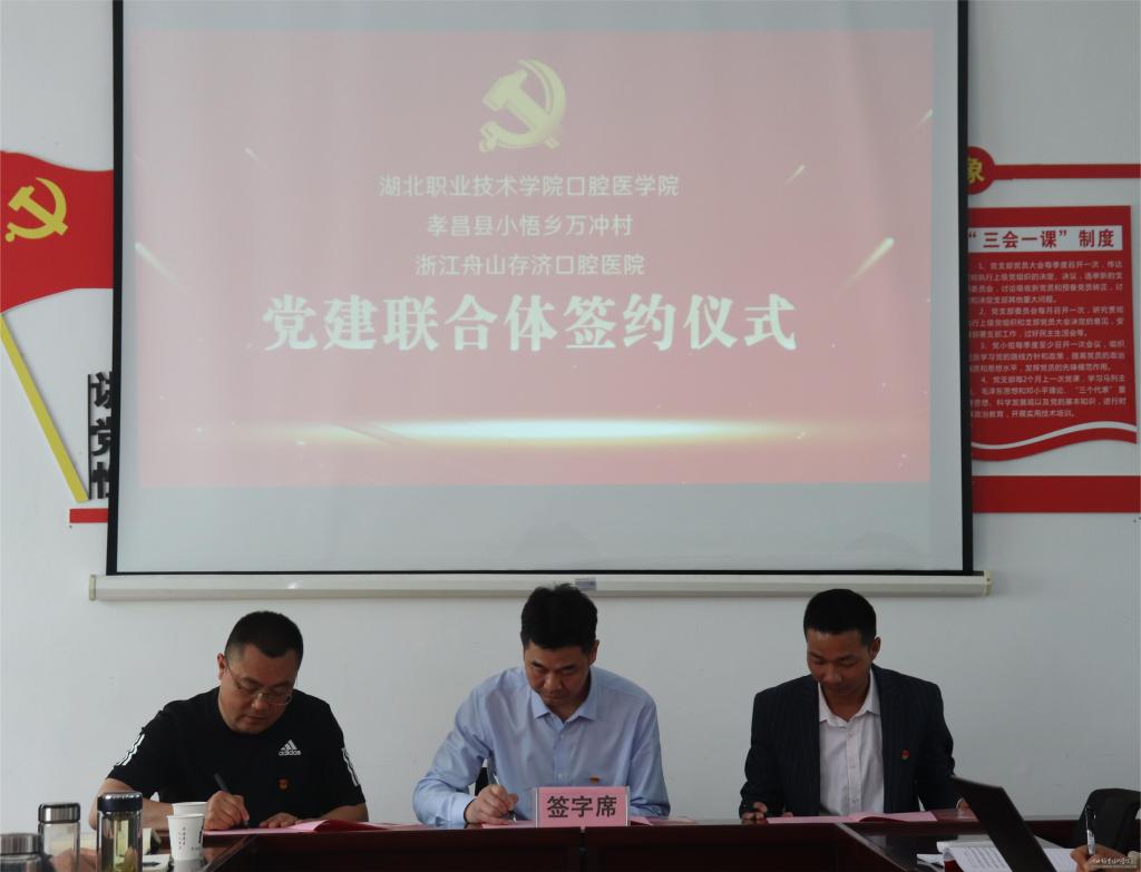 (本网讯 吴建桥 吴逸华)4月14日,口腔医学院党总支、孝昌县小悟乡万冲村党支部及浙江舟山存济口腔医院党支部在万冲村堂群服务中心举行校地企党建联合体签约仪式,小悟乡党委委员、副乡长刘颖主持活动。