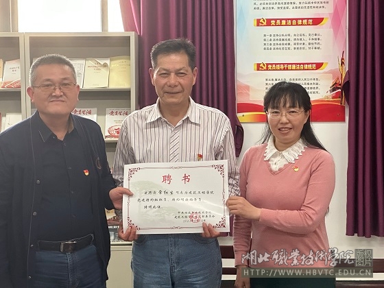 工会办公室主任(离退休工作处)谭之平、建筑工程学院院长郭自灿给常红生、牟一君、沈鹏飞颁发“党建特约组织员”、“特约阅读指导员”聘书。