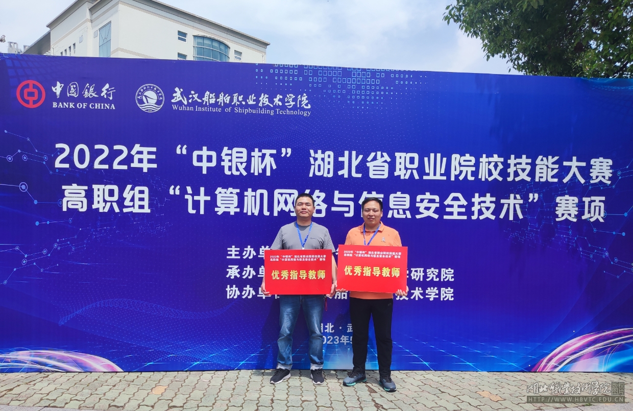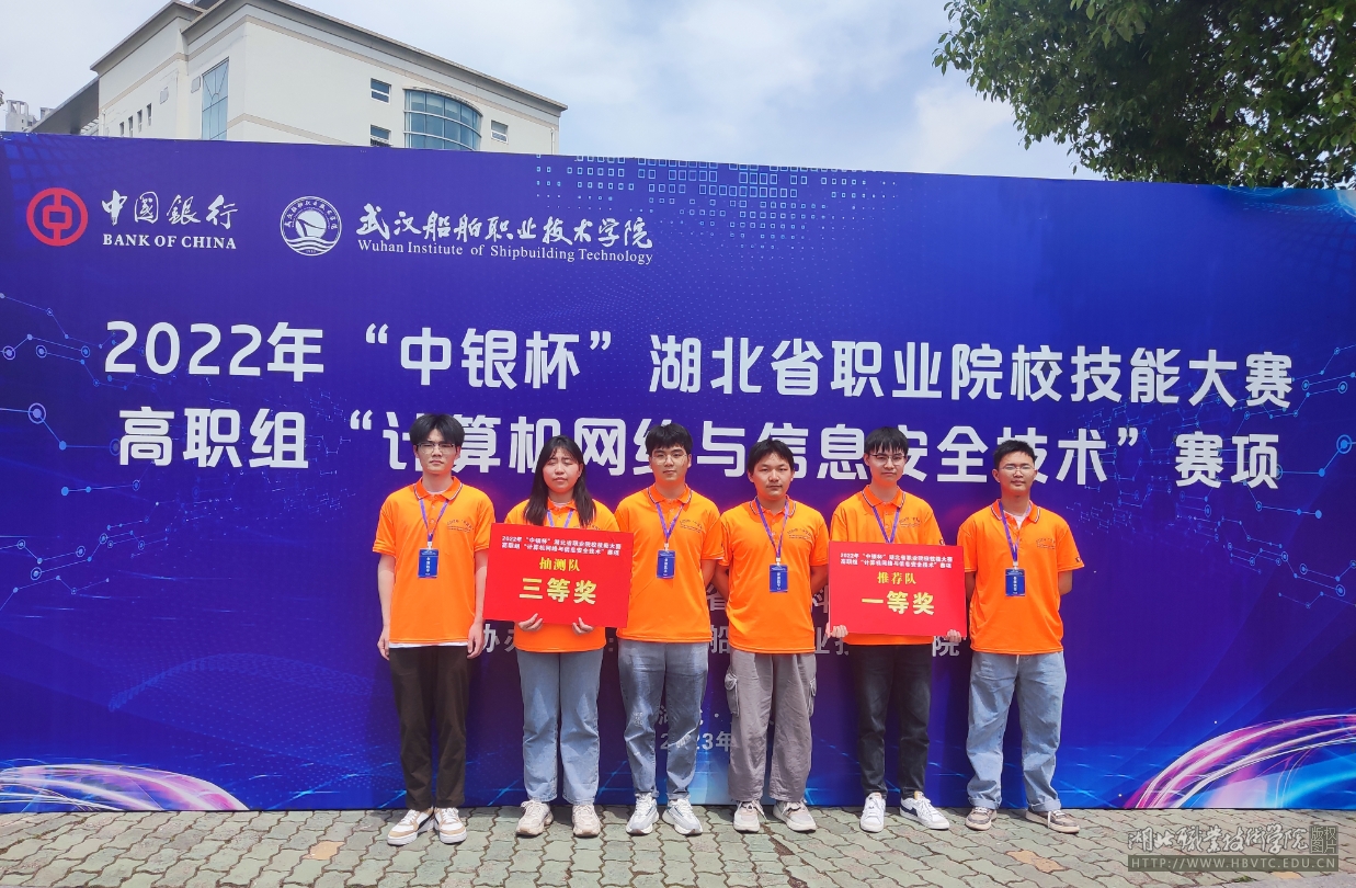 (本网讯 叶潘)5月12至14日,2022年“中银杯”湖北省职业院校技能大赛高职组“计算机网络与信息安全技术”赛项在武汉举行,来自全省43所高职高专院校的推荐队和抽测队参加了比赛。经过激烈角逐,信息工程学院推荐队选手张键、彭旭、罗思遥荣获团体一等奖,抽测队选手韦天翔、郑佳乐、董雨晴荣获团体三等奖,指导教师孙健、叶潘荣获优秀指导教师奖。