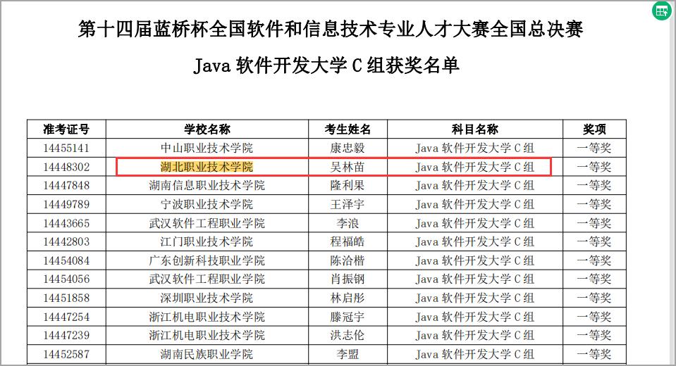 (本网讯 肖智兵 )近日,第十四届“蓝桥杯”全国软件和信息技术专业人才大赛全国总决赛Java软件开发C组个人赛获奖名单出炉,我校信息工程学院学生吴林苗获全国一等奖,龚芹、谌天伦获全国三等奖,蔡棕彦获全国优秀奖。