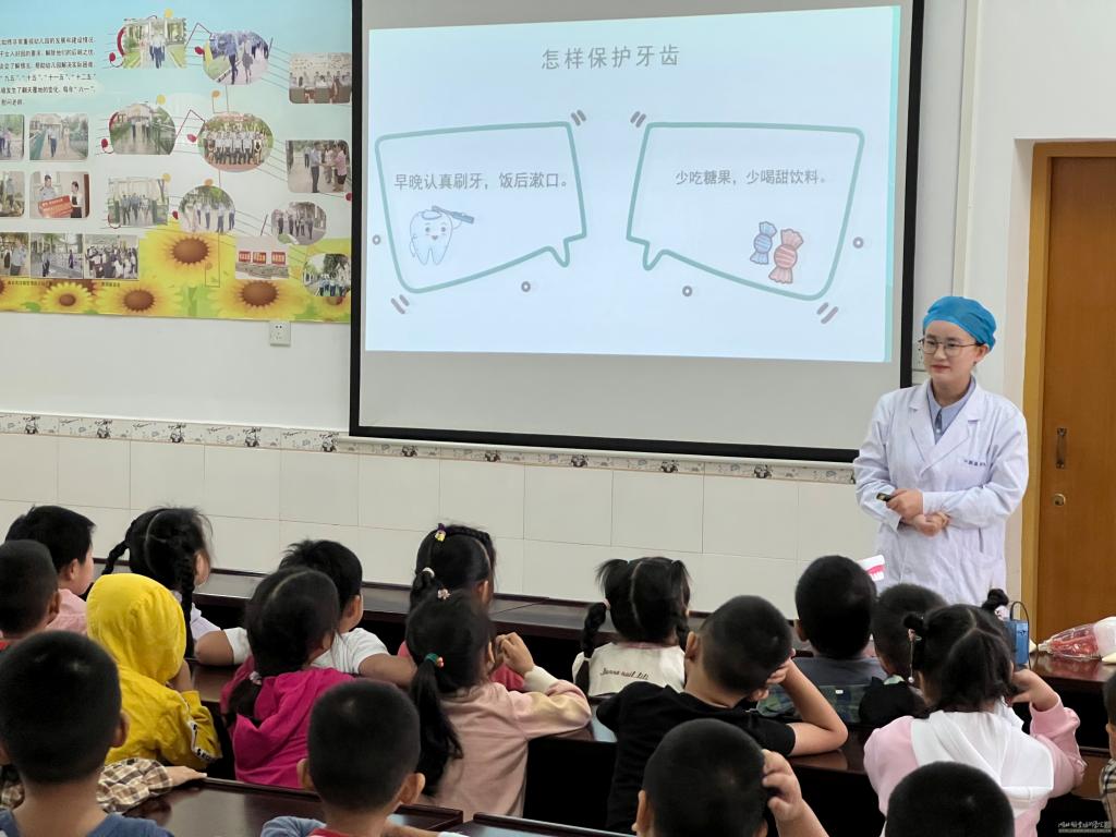 在口腔健康宣教活动现场,口腔医学院教师何灿对幼儿园师生讲解儿童口腔常见疾病龋病的发生原因、儿童龋病的预防方法、中华口腔医学会发布的“爱牙八条”核心信息以及培养良好的口腔卫生习惯等口腔健康常识。在互动环节,幼儿园儿童们踊跃抢答,反响热烈。