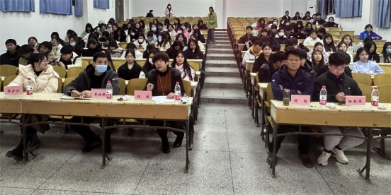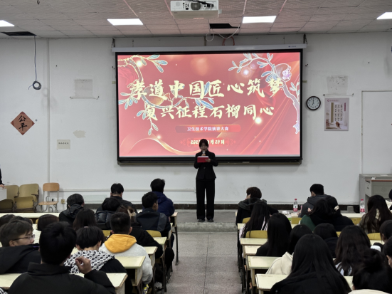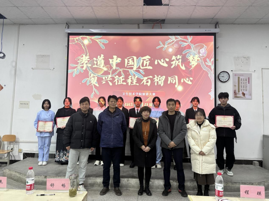 (本网讯 陈文培)为激发我院学生鼓起奋进新征程、建功新时代的精气神,积极投身学校复兴之旅,展示大学生“强校有我”“成才报国”的生动实践,营造向上向善、团结共融的校园文化氛围,11月29日晚7点,卫生技术学院在厚学楼隆重举行“孝道中国匠心筑梦,复兴征程石榴同心”演讲比赛。卫生技术学院党总支书记程瑛、副院长龚晓斌、学工办主任舒畅、冷敏杰老师、陈沙沙老师受邀担任比赛评委。