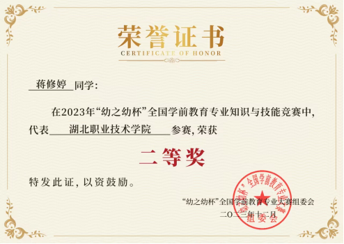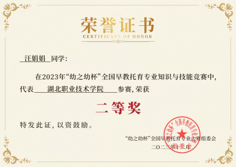 (本网讯 王叶)近日,“幼之幼杯”大赛组委会公布,我院蒋修婷同学荣获2023年幼之幼杯全国学前教育专业知识与技能竞赛二等奖,汪娟娟同学荣获2023年幼之幼杯全国早教托育专业知识与技能竞赛二等奖。