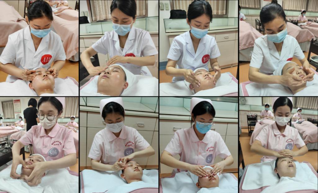 本赛项设置了学生组与教师组,竞赛内容参照“湖北工匠杯”美容服务业技能大赛标准,包括理论竞赛与技能竞赛两部分,理论竞赛特邀企业导师与校内专家联合出卷,进行线上考核,成绩占比30%;技能竞赛是老化皮肤面部护理,成绩占比70%,重点考查参赛选手知识应用能力、技能操作能力、沟通交流能力及美容职业素养等。赛场上,12名选手有条不紊、自然流畅地为顾客卸妆、清洁面部、舒缓按摩、涂抹护肤品,展现了师生娴熟的专业技能和良好的职业素养。