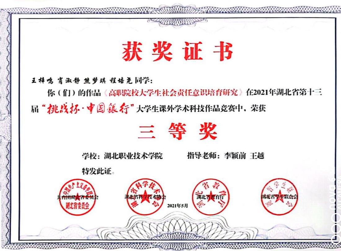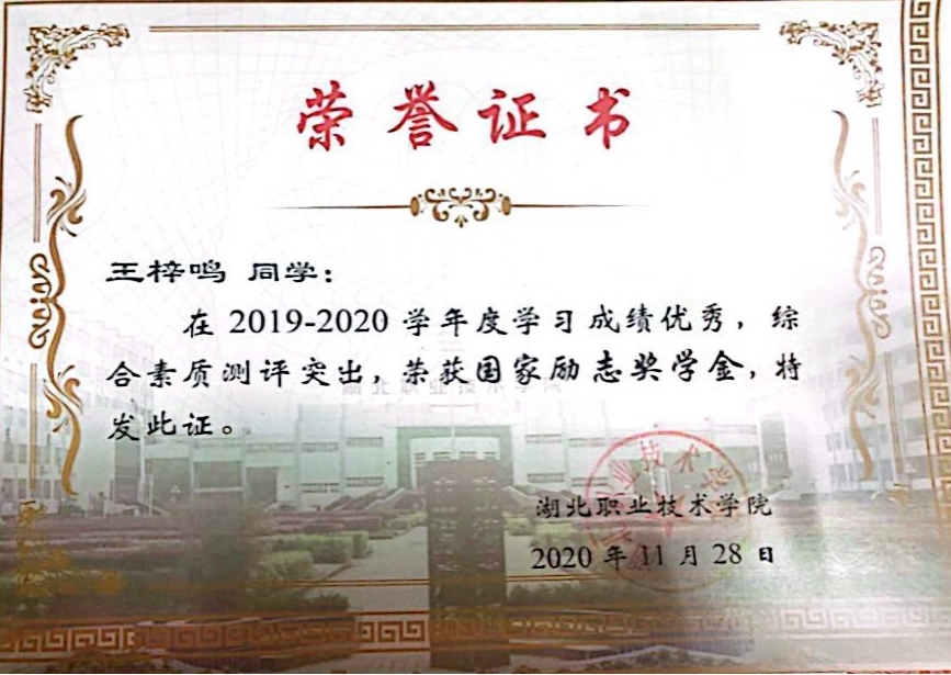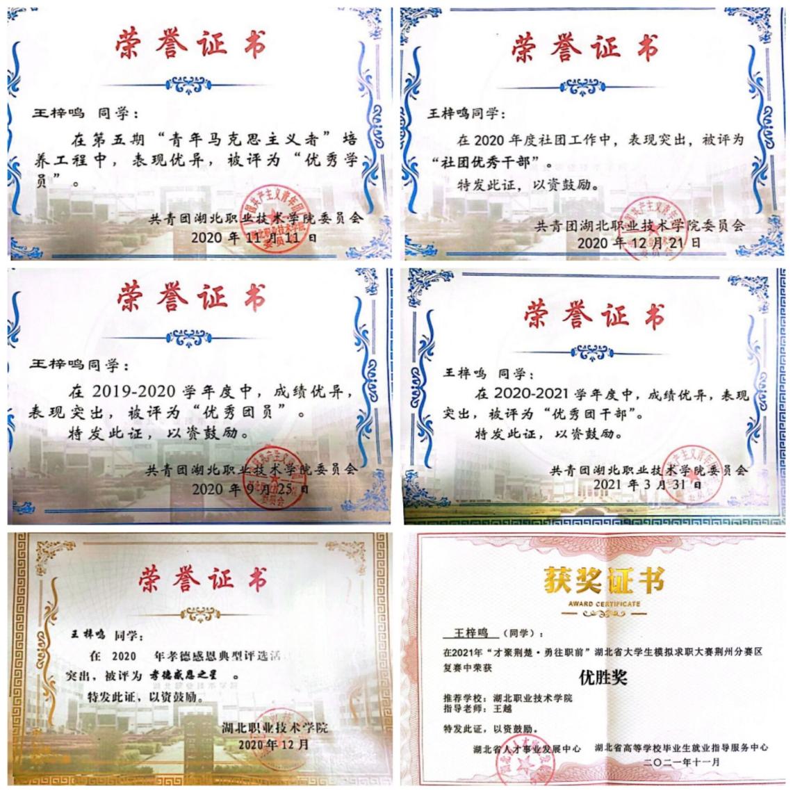 在湖北职院期间,他创立了学术型社团“睿叮社”,开展各类学术活动。他先后荣获校“感恩先进个人”、青马工程“优秀学员”“社团优秀干部”“优秀团员”“优秀团干部”等称号。