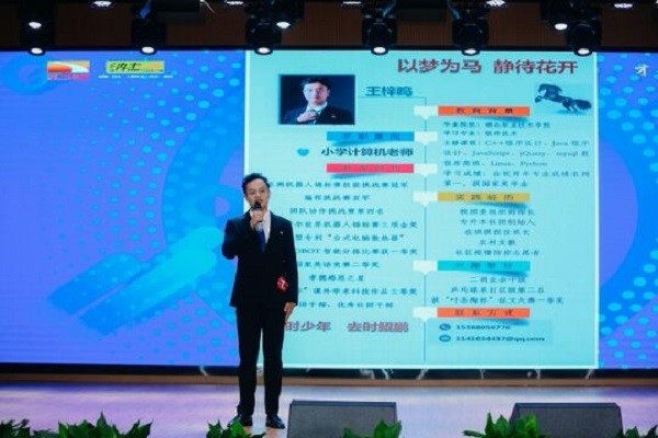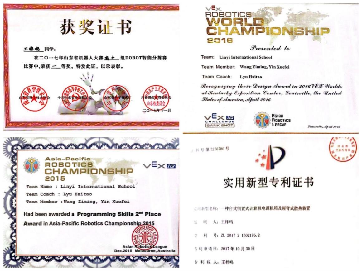2019年9月,王梓鸣满怀期待融入中华孝文化名城,就读我校信息工程学院软件技术专业。在中学时代,他在各类省级、国家级比赛中屡屡获奖。在VEXIQ机器人世锦赛和亚锦赛均获金奖,在山东省机器人大赛中获得一等奖,在全国中学生英语能力竞赛中获二等奖,在“叶圣陶杯”全国中学生新作文大赛中获一等奖,“一种台式倒置式计算机电源机箱及屋脊式散热装置”获实用新型专利授权。