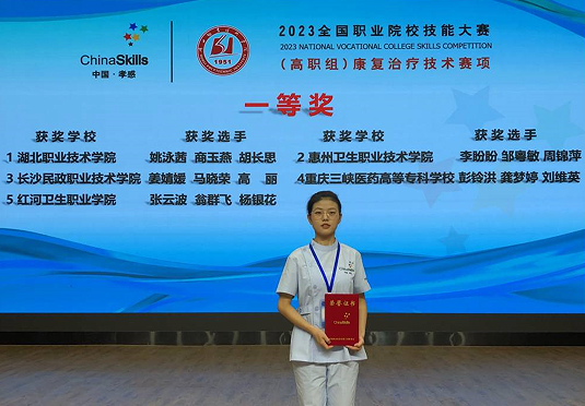 姚泳茜,女,中共预备党员,九州线上平台卫生技术学院康复治疗技术专业2024届毕业生。2023年7月,在陈红平、罗萍等老师指导下,与团队成员一道荣获2023年全国职业院校技能大赛(高职组)康复治疗技术赛项团体一等奖。荣获2021至2022学年度、2022至2023学年度国家励志奖学金,获得湖北省中西医结合医院“优秀实习生”称号。获得专升本免试资格,2024年9月将进入本科阶段深造。
