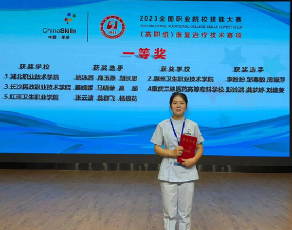 2023年7月,在陈红平、罗萍等老师指导下,商玉燕与团队成员一道荣获2023年全国职业院校技能大赛(高职组)康复治疗技术赛项团体一等奖。